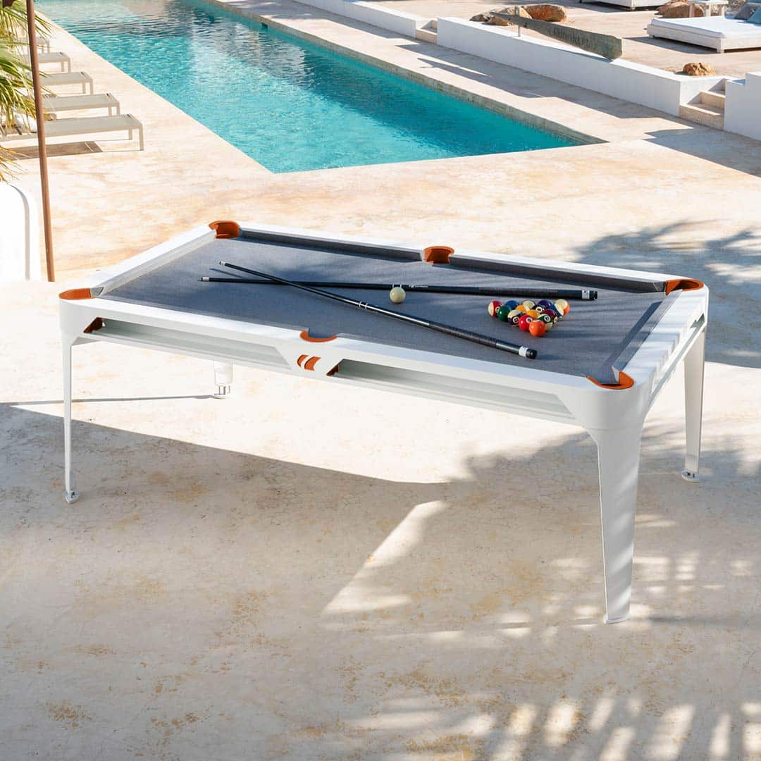 We are proud to bring another family of products into our collection. We are now offering a variety of outdoor billiards tables. The RS Barcelona Diagonal Outdoor Pool Table, the Cornilleau Origin Outdoor Pool Table, the Cornilleau Hyphen Outdoor Pool Table, and the 3000 Series outdoor pool table which are ideal for resorts, apartments, high end residential, community pools, etc. With the latest technology, now you can enjoy billiards outdoors. The 3000 Series comes with a 5 year manufacturers warranty, stainless steel hardware, single piece slate top, and it’s final weight is about 800 lbs. The outdoor billiards tables are solid, stable, and durable. As you can see by the pictures on this page, these tables hold up well in sunny climates and especially at resorts where they take their fare share of use and abuse from kids and adults.