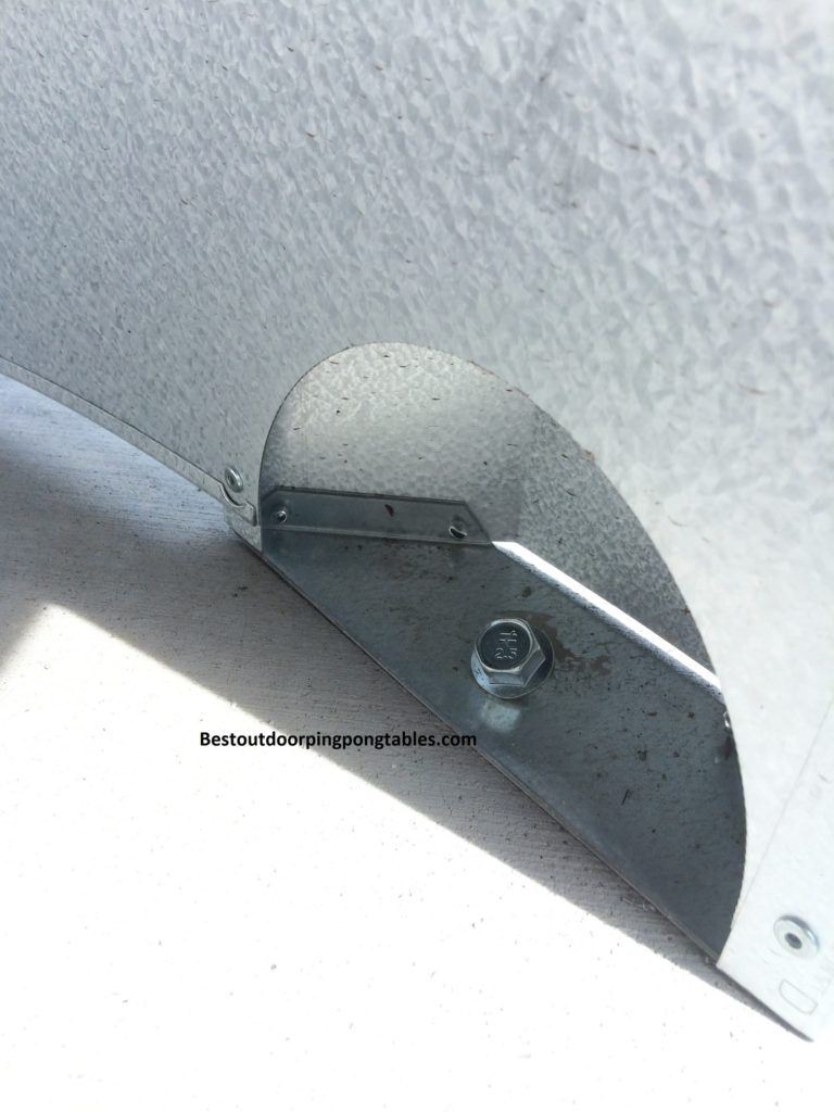 Frame/Design – Let’s start with the most impressive aspect to the table, the stylistic curved leg design. The 2 1/4″ structural galvanized steel frame is scratch and corrosion resistant. That’s one reason these tables are being purchased by parks and recreation programs around the United States. They can last outdoors for years and show no signs of wear and tear. Safety is not really an issue since the table doesn’t fold up to playback or storage mode. We do like the corner protection pads (we have a photo below) since they help little kids from getting hurt while running around the table. With more of an open frame design to the table, I can see how kids might want to climb underneath the table and play around. The metal pieces on our table were not sharp, but something parents should watch out for.