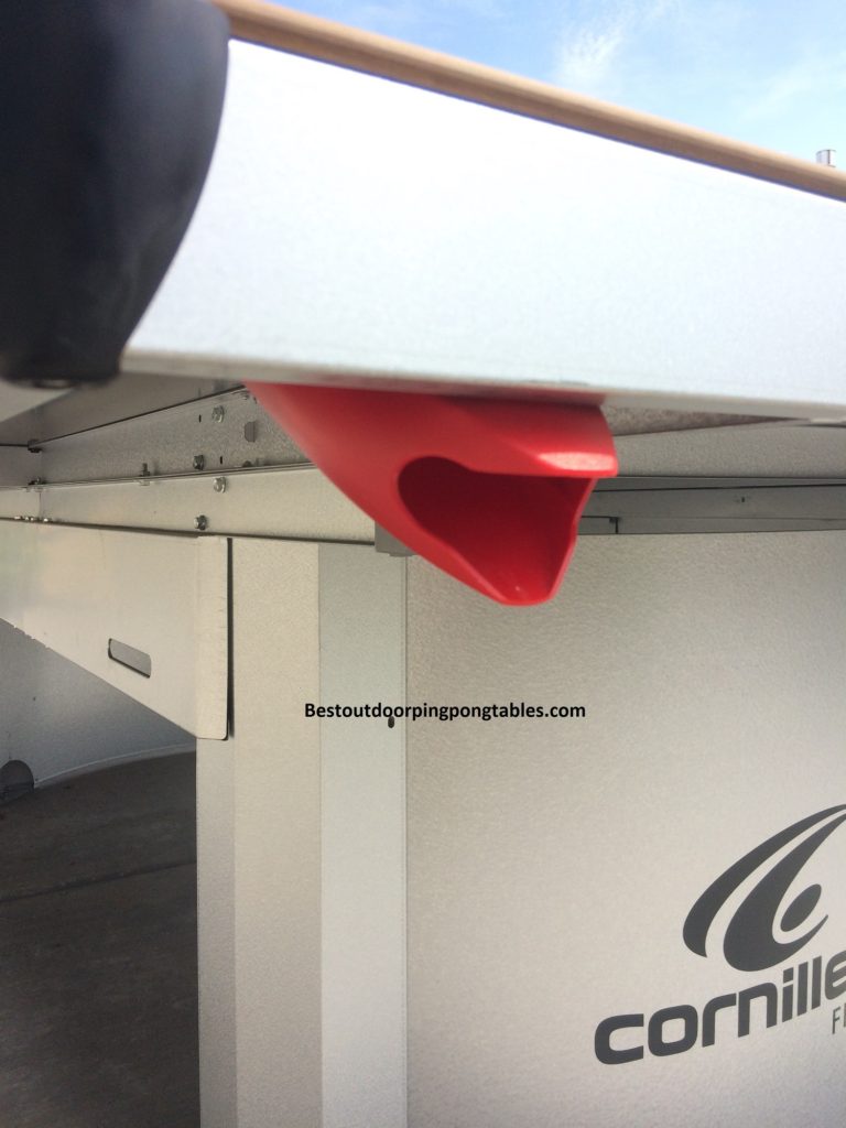 Additional Features – The tamper proof steel net will last a lifetime and I realize why many people go with that option if they are going to put the table into a public area like parks or resorts. Personally, I would buy the standard net kit which is optional. The regular net makes for much more fun playing conditions. I have played on the Cornilleau 510 Pro Outdoors many times and never had a ball hit the steel net and bounce over. The steel net rejects every ball that barely hits the top and ricochets it way off the table. You can adjust the regular mesh net for height and tension. There is a holder for your bats (paddles) on both sides of the table – storage for up to 4 ping pong paddles. The ball dispensers are very similar to those found on the Cornilleau 600x – right at the end of the table where they are convenient for players to retrieve new ping pong balls anytime.