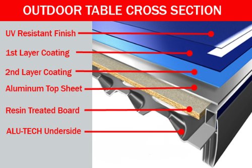 • All outer edges are protected and supported by a 1″ aluminum apron; apron design cradles table top to resist warping